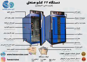 بدنه این دستگاه میوه خشک کن ۲۴ کشو گاز سوز از ورق گالوانیزه مقاوم و ضدضربه با رنگ کورهای الکترواستاتیک ساخته شده است. ارتفاع دستگاه 120 و عرض وطول آن 55 سانتی متر و عمق آن 100 سانتی متر می باشد. در دستگاه خشک کن میوه و سبزی از پلکسی نشکن با نمایی شیشه ای استفاده شده تا با نور داخل به راحتی بتوانید مراحل خشک کردن محصول را بررسی و نظارت کنید.همچنین چرخ های زیر دستگاه جهت جابجایی آسان آن نیز از مواردی است که برای راحتی شما در ساخت این دستگاه خشک کن میوه و سبزیجات توسط تیم هواکروز در نظر گرفته شده است. سینی های دستگاه مفتول فلزی و توری پلی اتیلن است که بسیار مقاوم می باشند و کار نظافت و شستشو را برای شما آسان می کند.سینی های این دستگاه 48 کشو به ابعاد 32 در 48 سانت (با ظرفیت تقریبی 40 کیلوگرم مواد جهت هر بار استفاده) برای خشک کردن است.